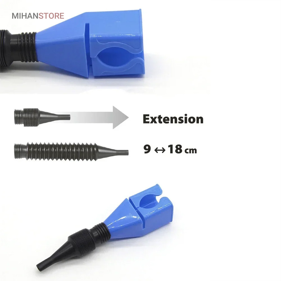 قیف خرطومی همه کاره ساخته شده از پلاستیک، قابل استفاده مجدد، انعطاف پذیر، سبک وزن و قابل حمل. قیف پلاستیکی ما با گردن پهن و دهانه پهن است که می تواند به سرعت مایع را بدون ریختن پر کند. بخش متصل شونده منعطف و قابل اتصال به انواع پت (شیشه نوشابه یک بار مصرف ) و گالن تا قطر 6 سانتیمتر می باشد و یک عدد لوله خرطومی با طول 20 سانتی و با دهانه خروجی  1 سانتی متر و کاملا قابل انعطاف به آن متصل است. برای تخلیه روغن، بنزین و آب از اتومبیل، کامیون، موتور سیکلت و ... تجهیزات صنعتی مناسب است.